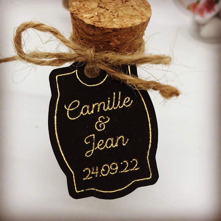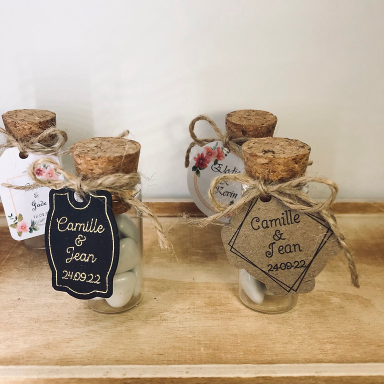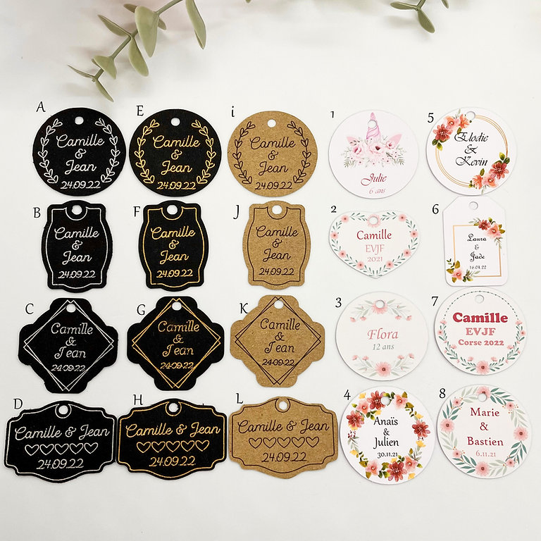 Leur plus long côté ou diamètre mesure 4cm. Il n'est pas obligatoire d'avoir la même inscription ou la même étiquette pour tout le lot, si vous voulez vous en servir de porte nom c'est tout à fait possible.